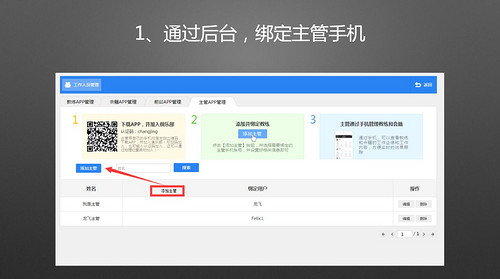 本系统支持在手机上使用主管功能,首先,需要在后台系统里绑定主管的手机。
